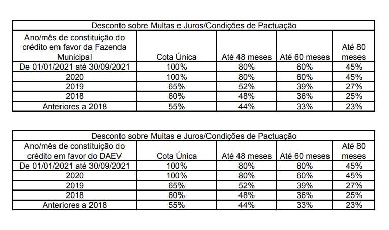 O REFIS-2021 de Valinhos, que tem sido estruturado desde o início do ano, contempla desde isenção à descontos escalonados em juros e multas dos tributos municipais e contas de consumo de água do DAEV, sobretudo em relação aos anos de 2020 e 2021, foco principal do programa, pelos impactos da Pandemia. Também atua sobre dívidas anteriores a 2019, conforme tabelas a seguir:
